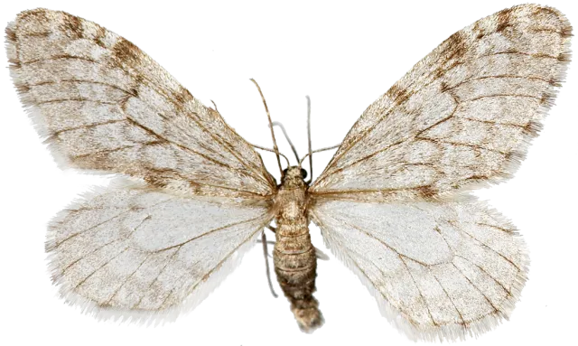 Hunnen har sterkt reduserte vinger; framvingen måler kun 3 mm.