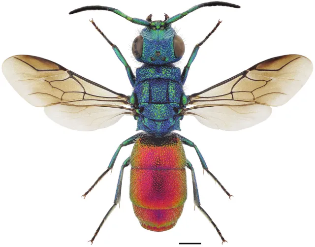 Blank biegullveps Chrysura radians hunn. Skala = 1 mm.