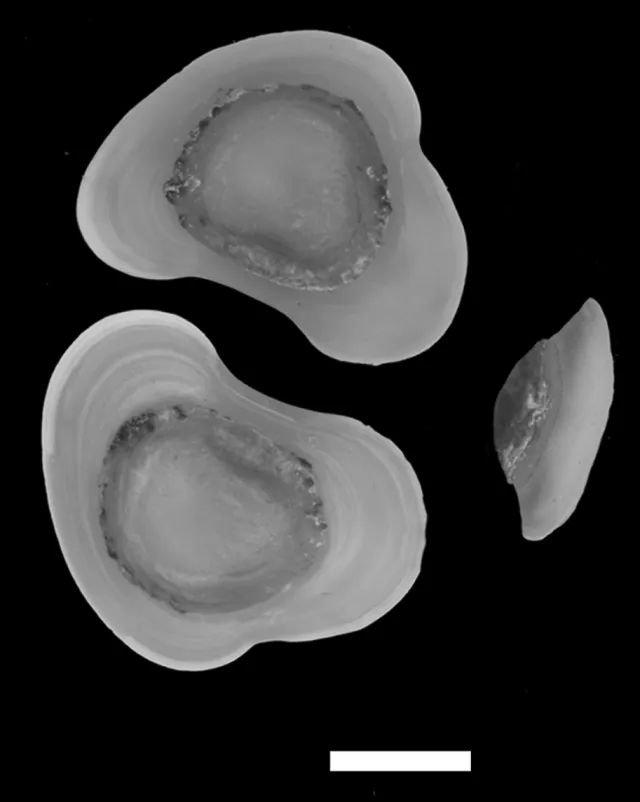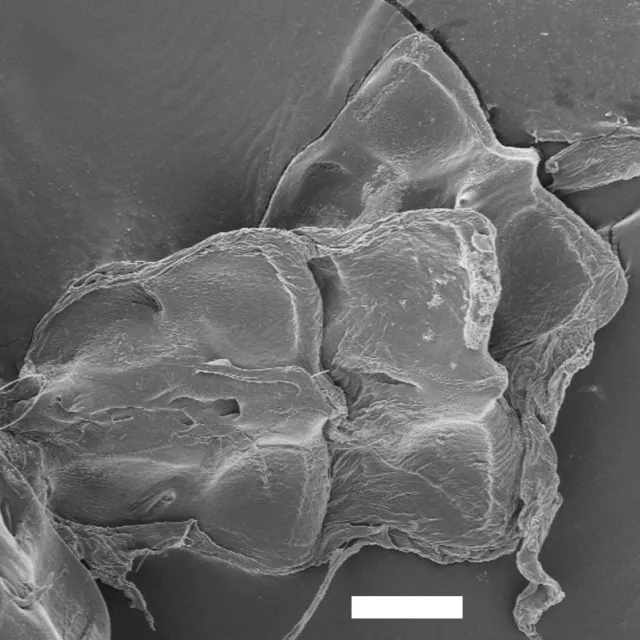 Skulpturen på skallets overflate (SEM), målestokk = 100 µm.