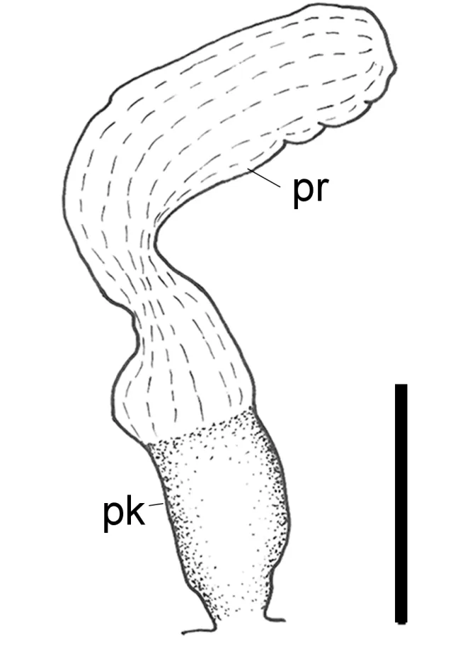 Det hannlige reproduksjonssystemet, målestokk = 5 mm. Forkortelser: pk: peniskammer, pr: prostata.