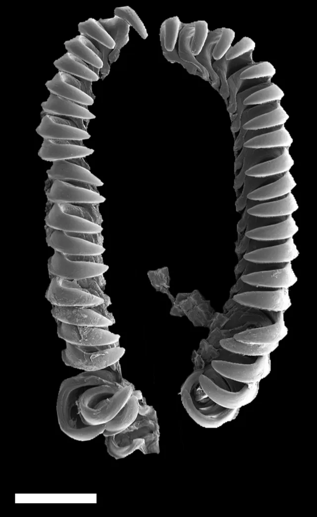 Radula, pilene peker til plasseringen av midttannen (rachidie) og detaljene av sidetennene, målestokk = 500 µm.