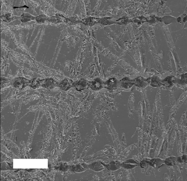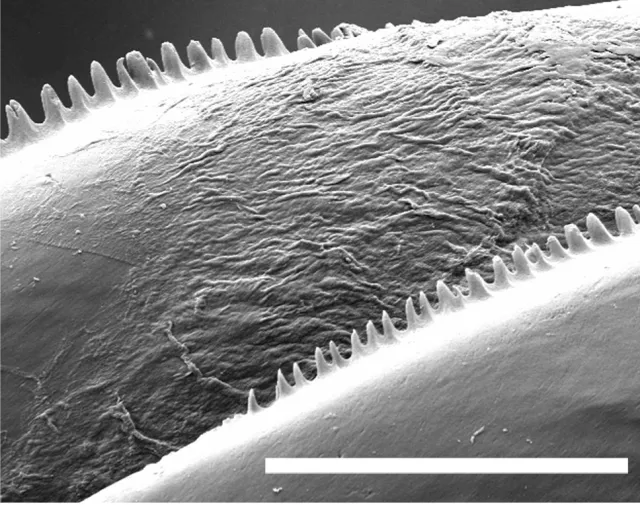 Dentikulasjonen på den ytre kanten av sidetennene, målestokk = 50 µm.