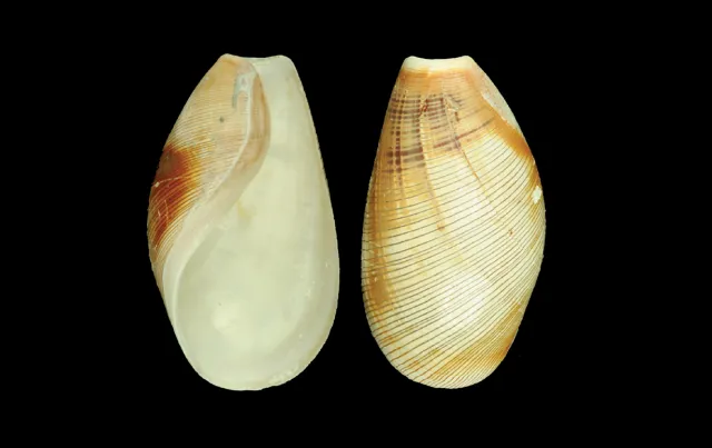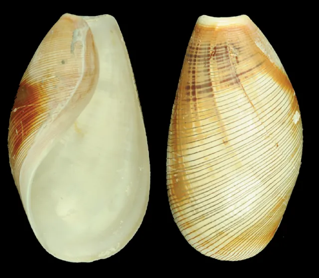 Det tykke skallet er utvendig og har vanligvis en pærelignende form sett ovenifra. Det tynne ytre laget av skallet (periostrakum) er ofte synlig og kan variere fra brunt til hvitt; selve skallet er hvitt. Åpningen er stor, der den øvre kanten er avrundet og vil i de fleste tilfeller ikke strekke seg forbi toppe av skallet (apeks). Skallet har et mønster bestående av store vekstlinjer og spirallinjer som består av små runde fordypninger som henger sammen. Størrelsen på skallet varierer mellom 3,6–70 mm.