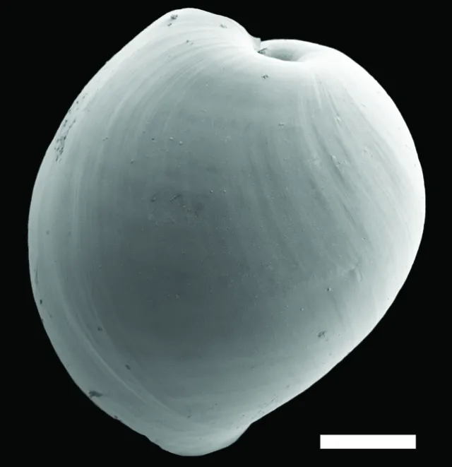 Skallets ventralside (SEM), målestokk = 0,5 mm.
