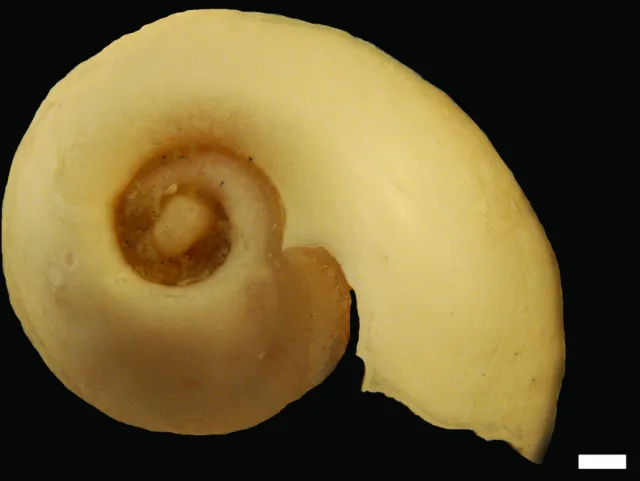Det tykke skallet er utvendig og hvitt til hvitaktig gjennomsiktig. Skallet er som regel ovalt og sylinderformet. Åpningen er stor og toppen av skallet (apeks) er nedsunket. Den eldste delen av skallet (protoconch) stikker litt ut av skallet (mamillat), men strekker seg ikke forbi den første vridningen an skallet. En umbilikalkanal (umblicus) er til stede på skallets nedre del. Overflaten av skallet et glatt. Lengden av skallet varierer mellom 3,7–5,8 mm.