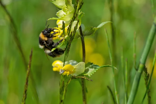 Hunn av hagehumle Bombus hortorum på engtjæreblom, Lønset i Oppdal, Sør-Trøndelag.