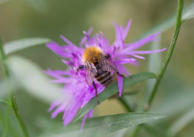Hann av bakkehumle Bombus humilis på knoppurt. Den spredte behåringen av lyse bånd på bakkroppen er typisk for litt slitte individer. Fra Agnes i Larvik, Vestfold.