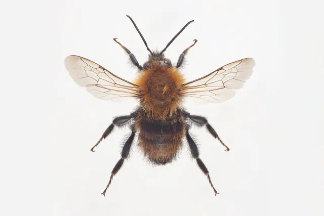 Bakstuss av bakkehumle Bombus humilis. Merk de lange svarte hårene på T4–T6 som hos åkerhumle Bombus pascuorum er lyse som grunnbehåringen.