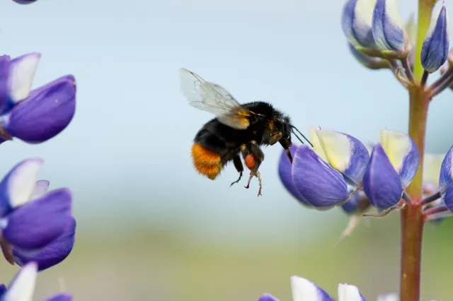 Dronning av steinhumle Bombus lapidarius på lupin, Karlstad, Sverige.
