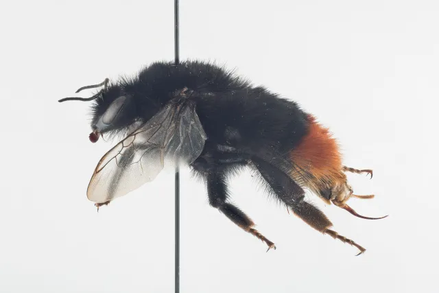 Dronning av steinhumle Bombus lapidarius fra siden. Merk den tette og korte behåringen.