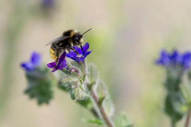 Hann av steinhumle Bombus lapidarius på oksetunge, Agnes i Larvik, Vestfold. Legg merke til de gule hårene i fjeset.