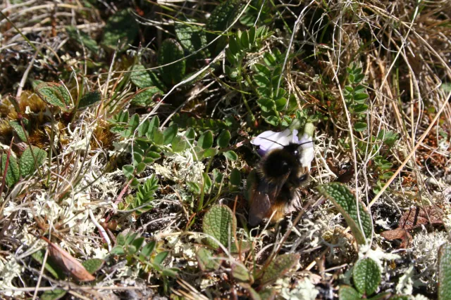 Hann av polarhumle Bombus pyrrhopygus på mjelt (Astragalus sp.) i kalkrik fjellhei på Finnshøa (1440 moh.) i Oppdal, Sør-Trøndelag. Ett av ytterst få kjente bilder av polarhumle-hannen fra naturen.