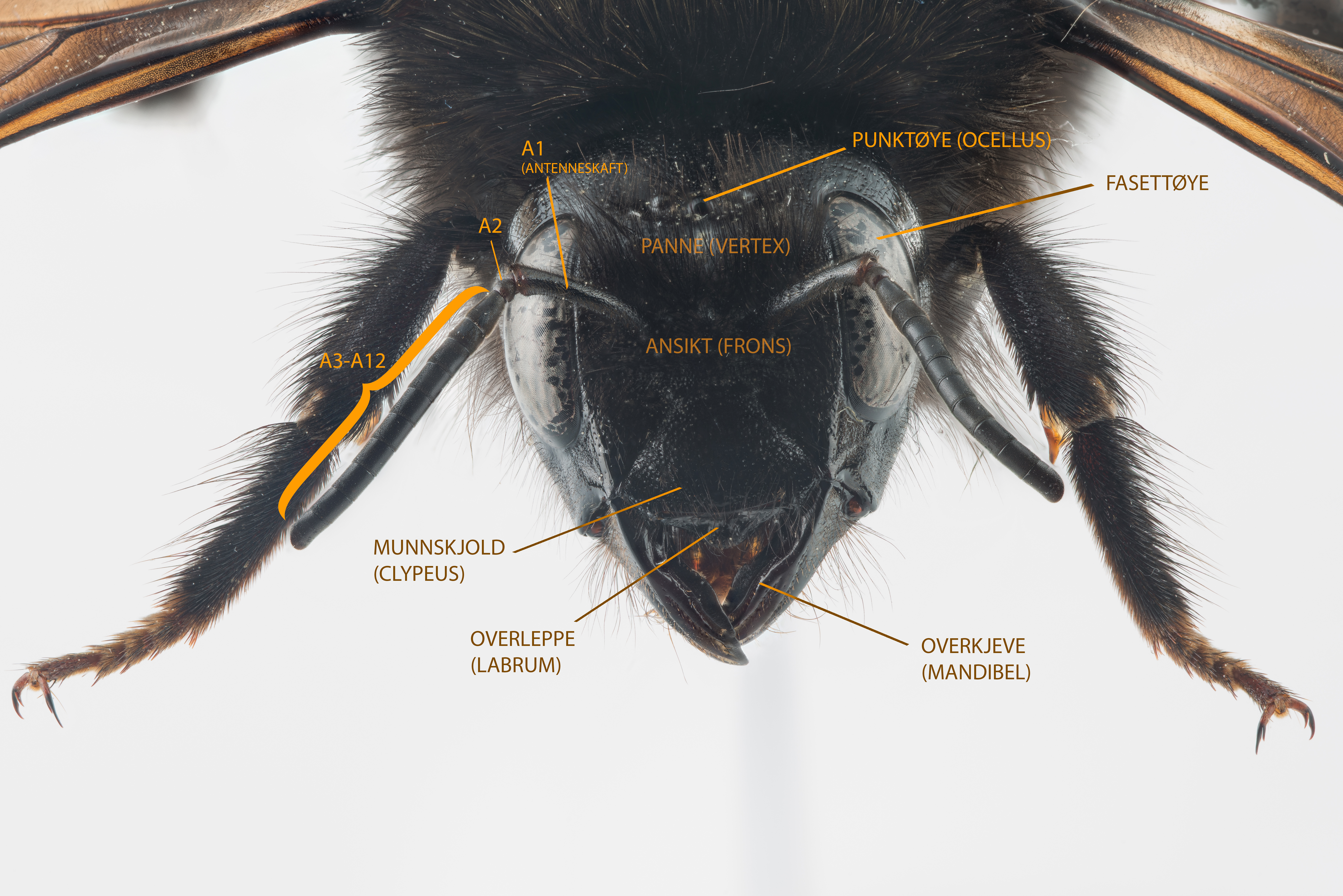 Humlehode sett forfra med angivelse av betegnelser som har betydning for artsbestemmelse. Bildet viser en hunn av steingjøkhumle Bombus rupestris.