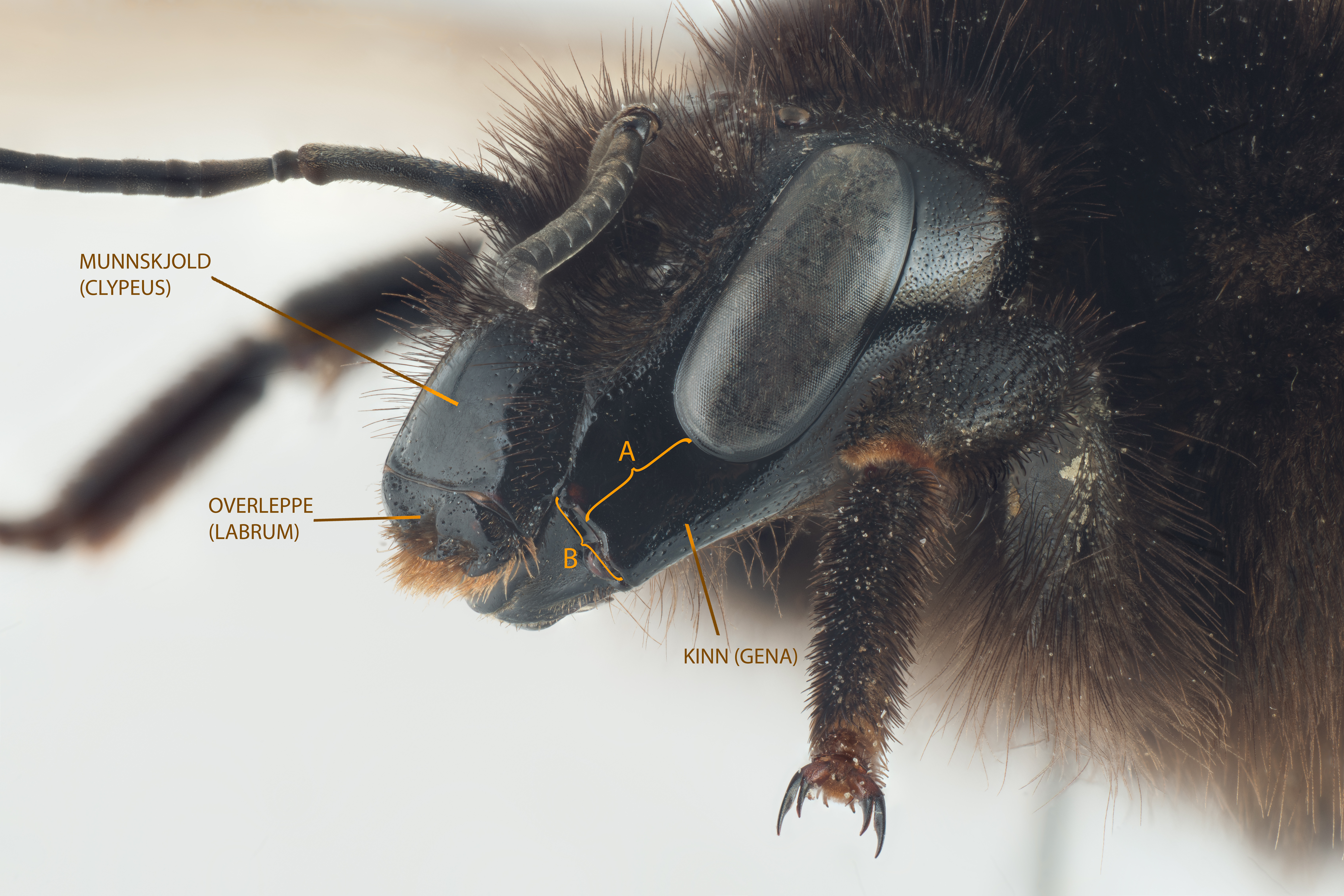 Humlehode sett fra siden med angivelse av betegnelser som har betydning for artsbestemmelse. Bildet viser en dronning av slåttehumle Bombus subterraneus.