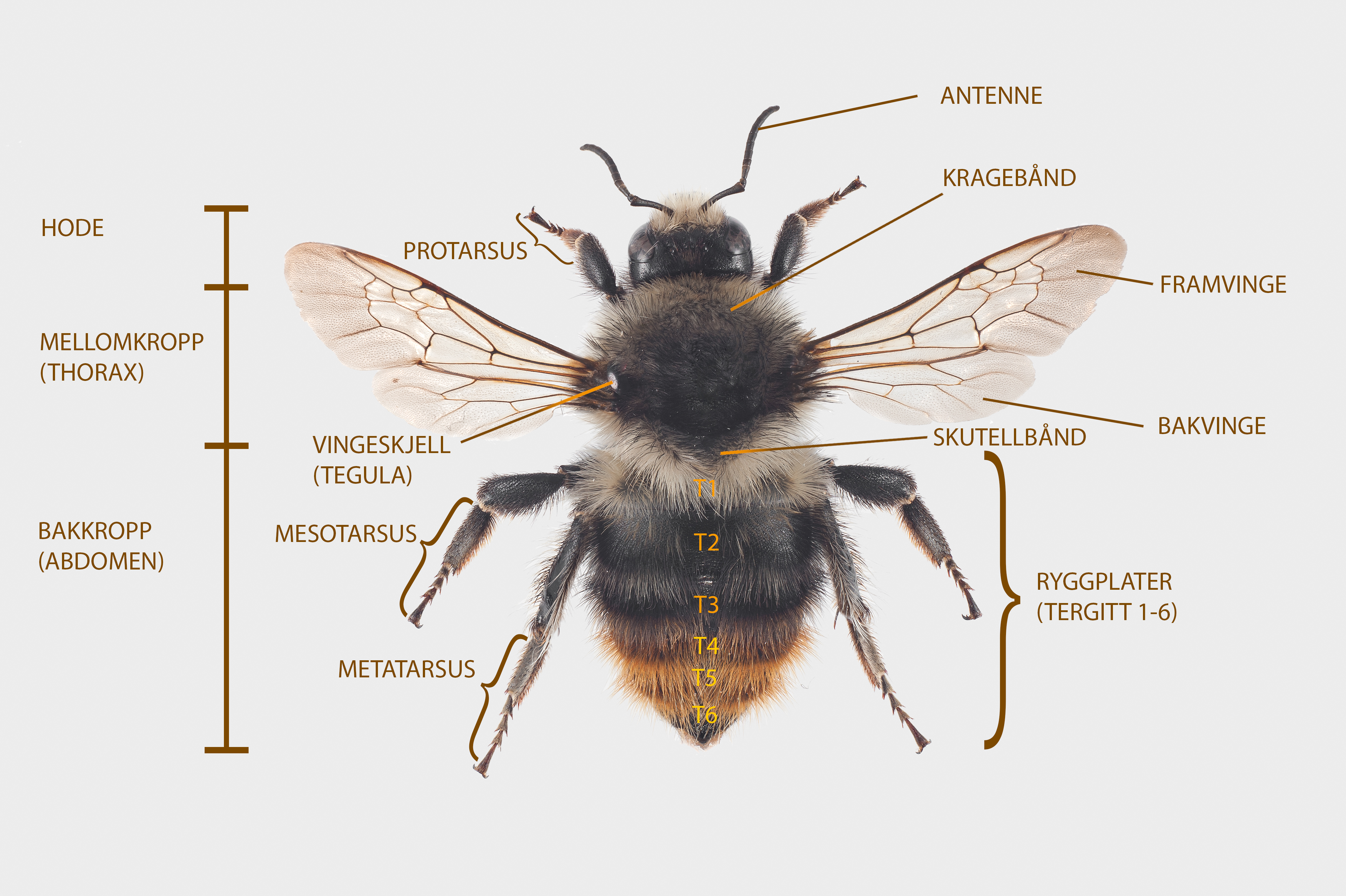 Humlekroppen sett ovenfra med angivelse av kroppsdeler og betegnelser som har betydning for artsbestemmelse. Bildet viser en dronning av enghumle Bombus sylvarum.