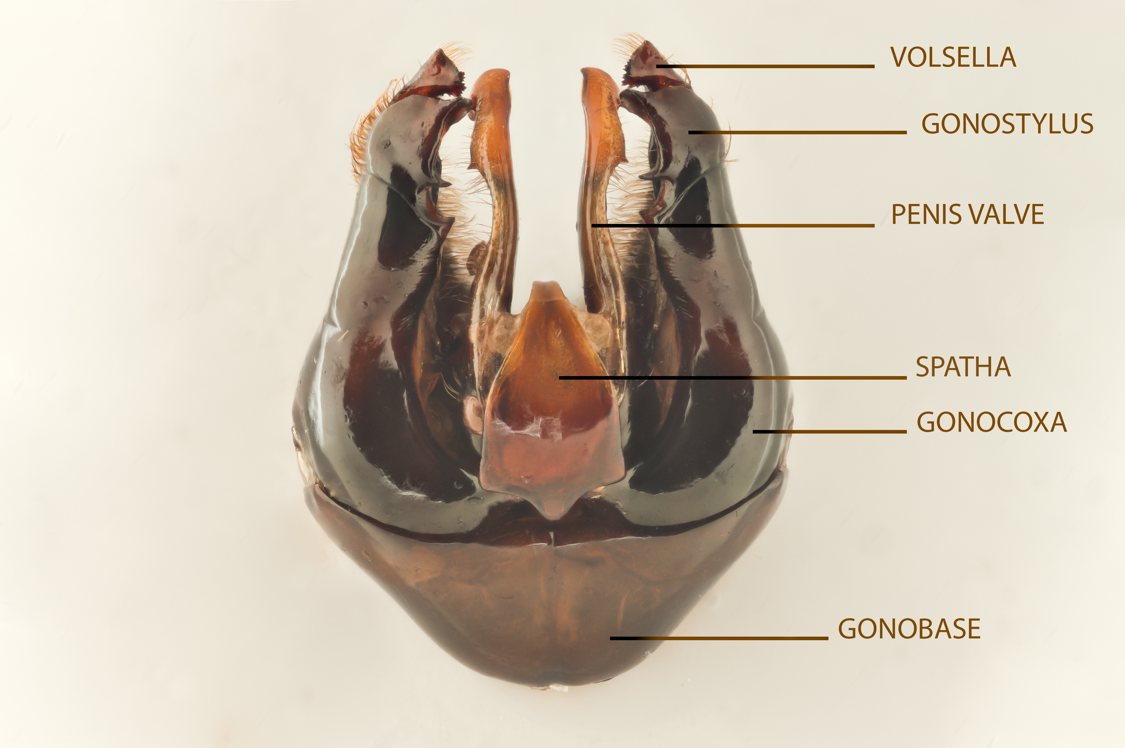 Hannlige genitalia av ei humle med betegnelser på de ulike delene. Bildet viser fjellhumle Bombus balteatus.
