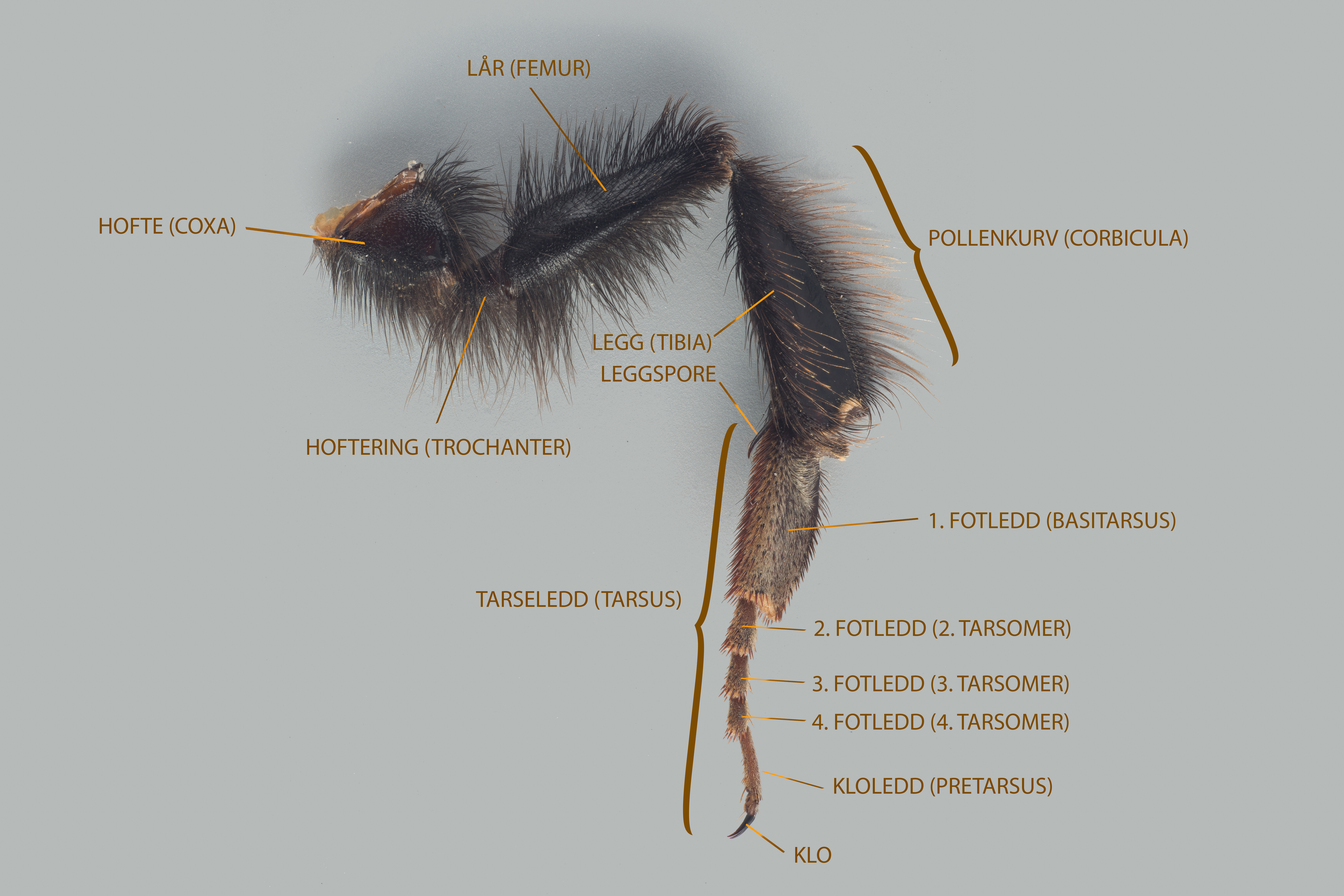 Bakbein av en hunn av en sosial humleart med navn på de ulike leddene, samt begreper som er brukt i humlelitteratur.