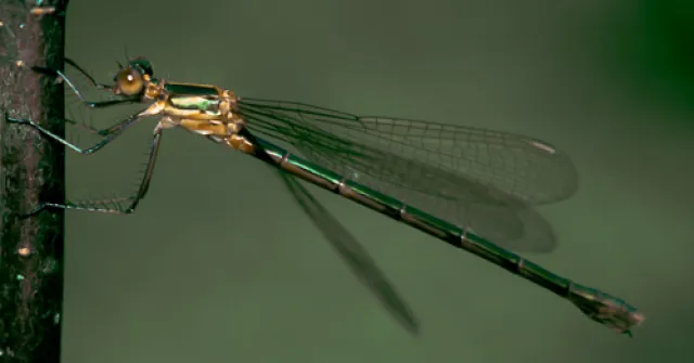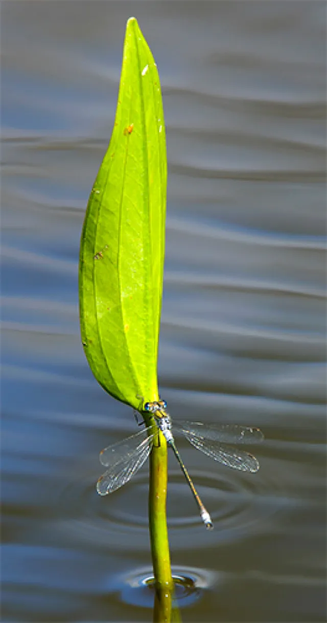 Hann av nordmetallvannymfe Lestes sponsa på vassgro. Arten liker stillestående vann med siv-vegetasjon, og hviler ofte med vingene delvis spredd.