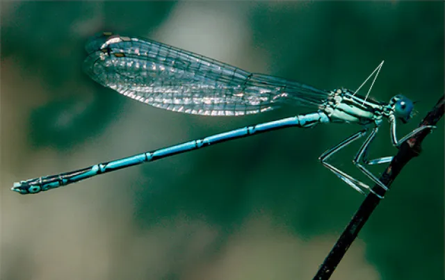 Hann av fjærbeinvannymfe Platycnemis pennipesArten skiller seg fra våre øvrige vannymfer på flere særtrekk. Et bra feltkjennetegn er de doble lyse skulderlinjene.