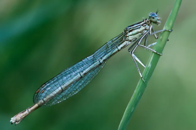 Hunn av fjærbeinvannymfe Platycnemis pennipesBegge kjønn har fortykkede, hvite legger med en svart lengdestripe og lange, svarte kanthår. Trekket er dog mest fremtredende hos hannen.