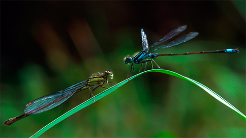 Hann (t.h.) og hunn (t.v.) av kystvannymfe Ischnura elegans. Bakkroppen er nesten rent svart med en lys tegning på ledd 8. Hos hunnen kan unntaksvis også det åttende leddet være mørkt.