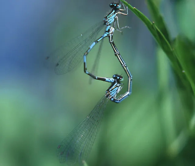 Nordblåvannymfe Coenagrion johanssoni i paring. Hannen øverst. Begge kjønn har blå grunnfarge.