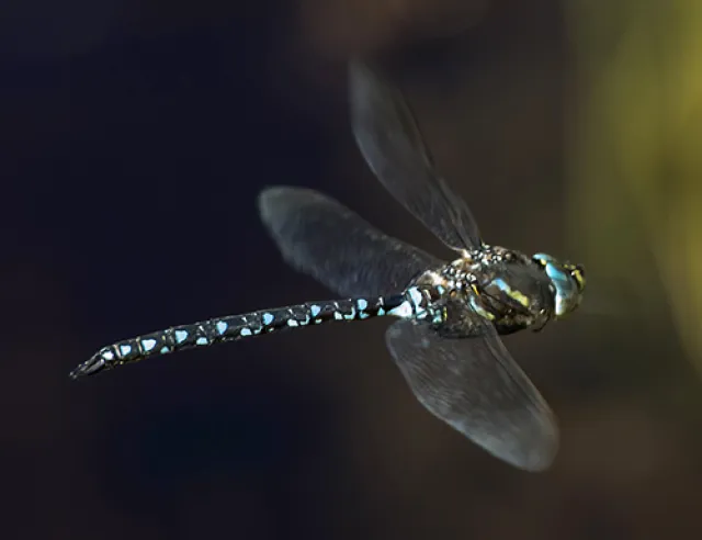 Hann av starrlibelle Aeshna juncea i flukt. Arten er en sterk flyger som bruker mye tid på å patruljere på utkikk etter bytter, partnere og rivaler.
