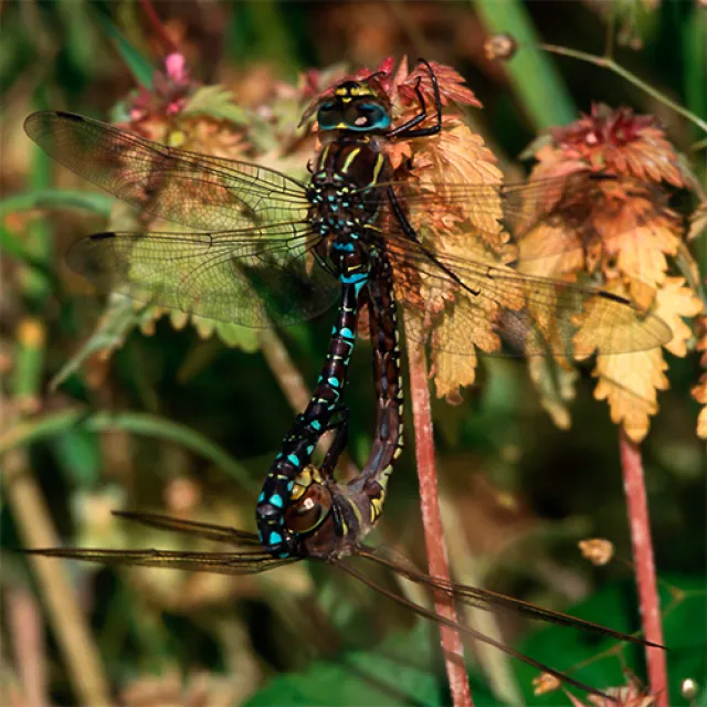 Starrlibelle Aeshna juncea i paring. Hannen med hodet oppover.