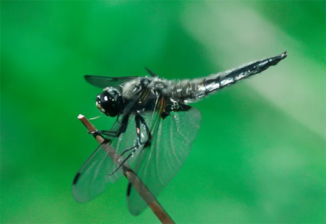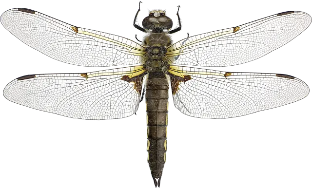 Hann av firflekkbredlibelle Libellula quadrimaculata. Arten er den vanligste av bredlibellene og kjennes lett på de svarte vingenodene.