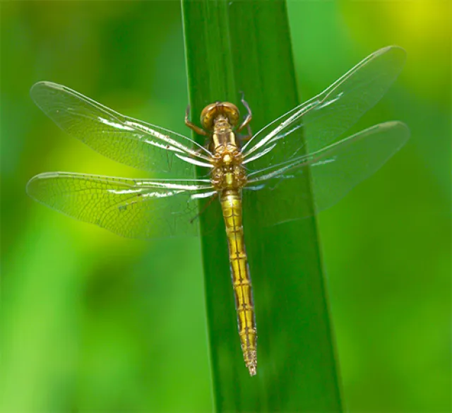 Nyklekket hann av småblålibelle Orthetrum coerulescens. Både hunner og nyklekkede hanner er oransje med svarte tegninger. De gule vingemerkene er et godt kjennetegn på begge kjønn.