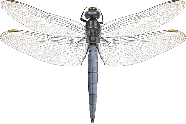 Utfarget hann av småblålibelle Orthetrum coerulescens. Hannen kan kjennes på den blå bakkroppen, de gulbrune vingemerkene og den klare vingebasisen.