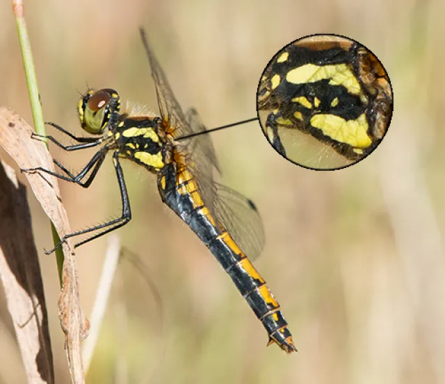 Hunn av svarthøstlibelle Sympetrum danae. Arten kan kjennes på fargetegningene på siden av brystet, som består av to gule diagonalbånd med tre gule flekker imellom.