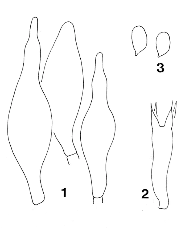 1. Cheilocystidier, 2. Basidium, 3. Sporer.
