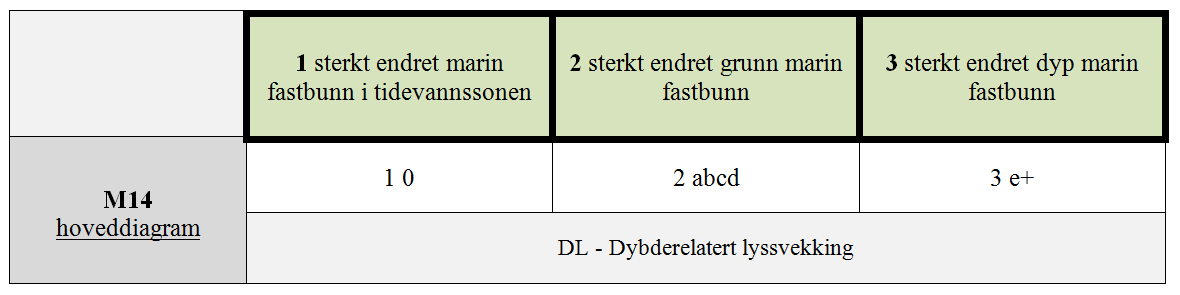 Det finnes knapt noen kunnskap om arealdekning, suksesjonsveger og variasjon i artssammensetning innenfor M14 Sterkt endret eller ny fast saltvannsbunn.
