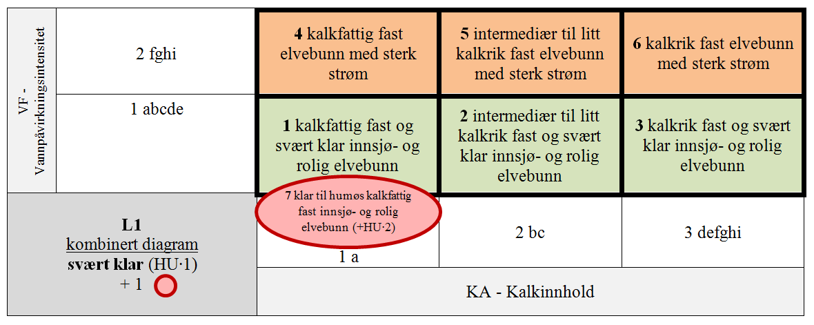 Variasjonen i begroingsalgesamfunnenes artssammensetning synes å være størst langs KA (S. Schneider, pers. med.). Schneider (2011) viser at det er signifikant forskjell i artenes pH-optima (AIP-indeksverdier; Schneider & Lindstrøm 2009) mellom vann med < 1 mg Ca/L (KA∙a) og vann med mellom 1 og 4 mg Ca/L (KA∙bcde), til dels også mellom sistnevnte klasse og vann med > 4 mg Ca/L (KA∙f+). Gradientlengden for Ca er imidlertid vanskelig å anslå på grunnlag av det tilgjengelige materialet. Schneider (2011) beskriver variasjonen langs KA slik: «Very Ca-poor reference rivers are characterized by moderately acidic species like Binuclearia tectorum or Microspora palustris. More acidic taxa like Scytonematopsis starmachii or Zygogonium spec. can be present in very Ca-poor and Ca-poor reference rivers, but they must be balanced by the simultaneous presence of less acidic taxa like Stigonema mamillosum or Bulbochaete spec. Hydrurus foetidus and Lemanea spec. are characteristic of all reference rivers with the exception of very Ca-poor, humic rivers. Heribaudiella fluviatilis is common in reference rivers with a Ca concentration above 1 mg/l, while Nostoc verrucosum is absent from very Ca-poor and Ca-poor rivers, but common in moderately Ca-rich rivers. The most acidic taxa are absent in reference rivers with a Ca concentration above 4 mg/l.» Dette indikerer at det skjer nær (eller over) en fullstendig utskifting av artssammensetningen mellom endepunktene av kalkinnholdsgradienten, altså en endring på mellom 3 og 4 ØAE. I så fall skal KA deles i (minst) 3 hovedtypetilpassete trinn og er en hLKM for L1 Eufotisk fast ferskvannsbunn. Også bunndyrsammensetningen er markert forskjellig mellom svært kalkfattige og kalkfattige innsjøer/elver (A.K. Schartau, pers. med.). Analysene av planteplanktonsammensetning i innsjøer (datasett B13; se NiN[2]AR2, kapittel B13) er også relevant for inndeling av L1; en rekke taksa opptrer både som plankton og som benthos. Disse analysene støtter også en inndeling av KA i 3 hovedtypetilpassete trinn, med grenseverdier mellom trinn satt ved 2 og 10 mg Ca/L. Som en tentativ løsning er disse grenseverdiene også benyttet ved inndeling av L1.