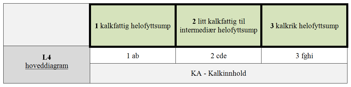 Helofyttvegetasjonen blir i mindre grad influert av miljøgradienter som bestemmer vannets egenskaper enn den øvrige vannvegetasjonen, bortsett fra ytre deler av helofyttbeltet der vannkvaliteten (særlig humusinnholdet) setter grenser for hvor dypt planter kan vokse. De viktigste miljøvariablene som påvirker helofyttvegetasjonen er knyttet til sedimentenes egenskaper; kornstørrelsesfordeling og innhold av organisk materiale. Tettheten og tilgroingshastigheten av helofytter er størst i næringsrike områder (Mjelde 1986). Endringer i vannstands- og vannføringsforholdene ved regulering har vel så stor innvirkning på helofyttene som på vannplantene (Rørslett 1984, Hellsten 2001, Mjelde et al. 2013). På bakgrunn av tilgjengelig informasjon, er kalkinnhold (KA) tentativt inkludert som hLKM for L4, mens øvrige miljøegenskaper som er kjent for å kunne forklare noe av variasjonen i artssammensetning innenfor helofytt-dominert ferskvannsnatur, S3, IO og HU, er inkludert som uLKM. Den foreslåtte hovedtypetilpassete trinninndelingen av KA er harmonisert med trinndelingen av KA i L2 Eufotisk limnisk sedimentbunn.