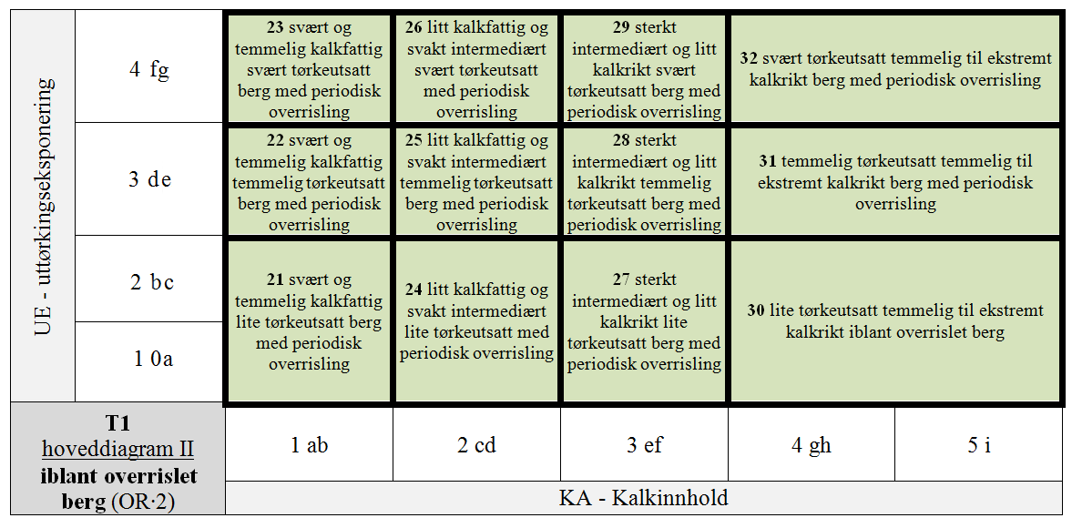 - T1-32 svært uttørkingseksponert temmelig til ekstremt kalkrikt iblant overrislet berg