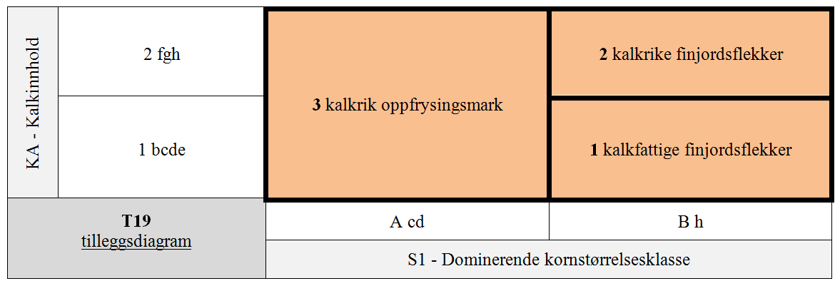 KA Kalkinnhold (tLKM): På finjordsflekkene (S1∙h) finnes tilstrekkelig variasjon i artssammensetning relatert til KA Kalkinnhold til å dele disse i en kalkfattig/intermediær (KA∙bcde) og en kalkrik (KA∙fgh) grunntype. Vardefrytle Luzula confusa er typisk for den fattige typen, mens snøfrytle Luzula nivalis ofte dominerer i den rike typen.