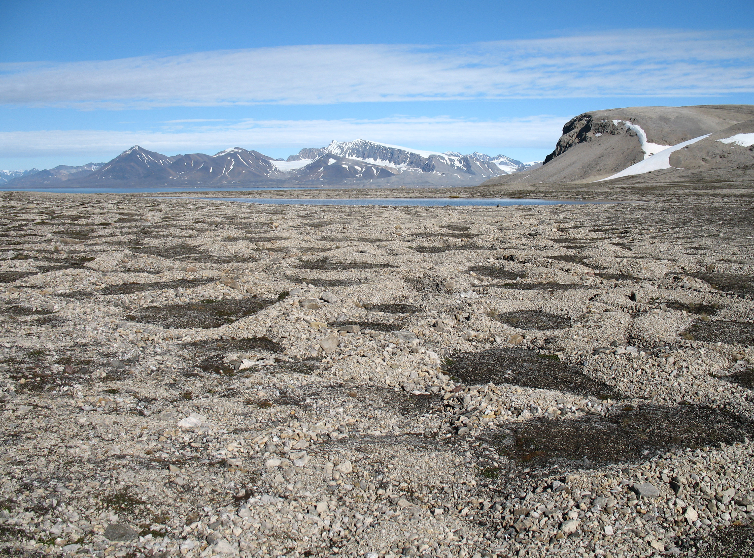 Oppfrysingsmark nær toppen av Tronden (Alvdal, Hedmark). Flekker med sammenhengende vegetasjon finnes nær steinsirklenes finjordsrike sentrum.