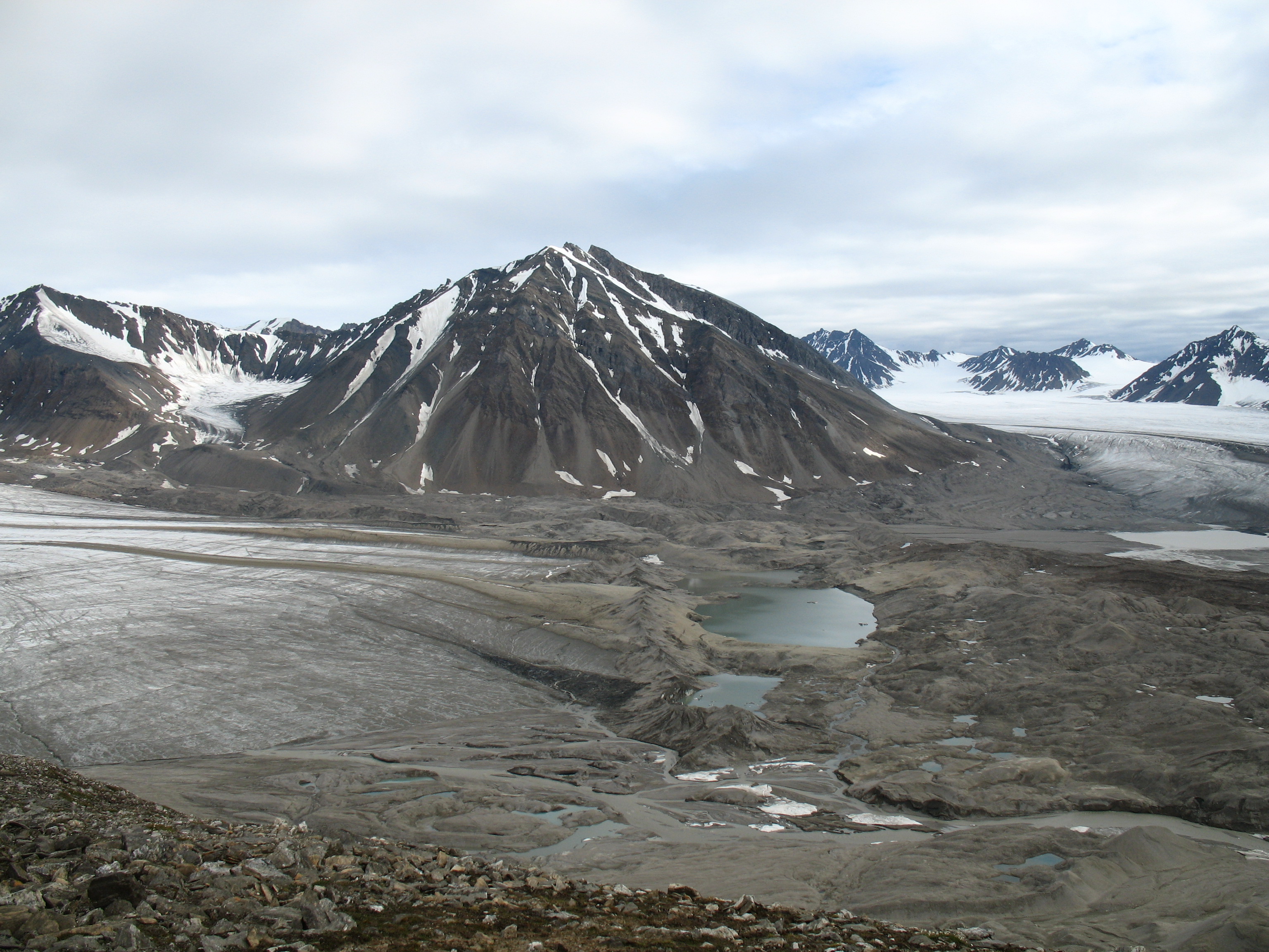 Breforland og snøavsmeltingsområde. Skjerdingsdalsbreen , som fortsatt kan ses i bildets overkant (bildet er tatt fra Dalsnibba, Geiranger, Stranda, Møre og Romsdal), har vært i rask tilbaketrekning gjennom ei årrekke (botnen under breen, hvor en liten skavl er synlig på bildet som er fra 2006, står avmerka som bre på kartet utgitt i 1995). Foran i bildet ses ulike morenetrinn.
