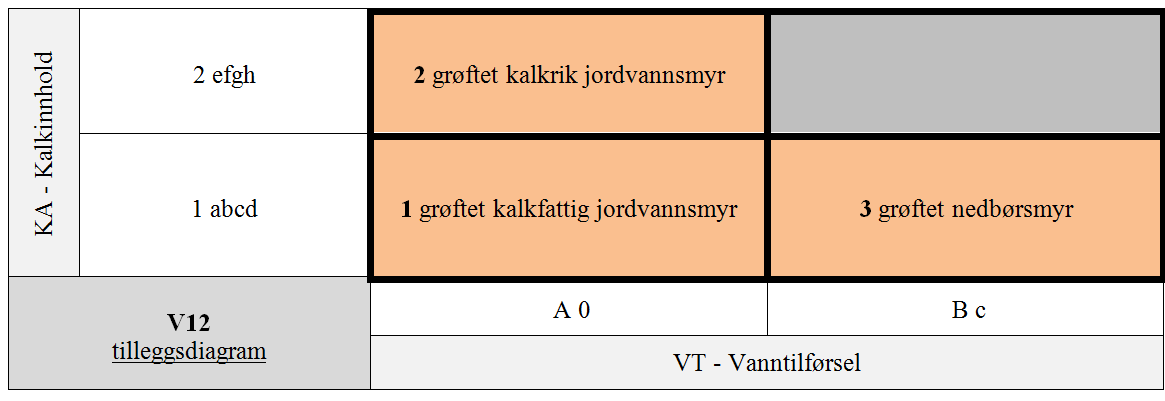 Det er antatt at det er grunnlag en grov inndeling av KA Kalkinnhold i to trinn som gir opphav til grunntypene V12-1 grøftet svært kalkfattig til svakt intermediær jordvannsmyr (KA∙abcd) og V12-2 grøftet sterkt intermediær til svært kalkrik jordvannsmyr (KA∙efghi).