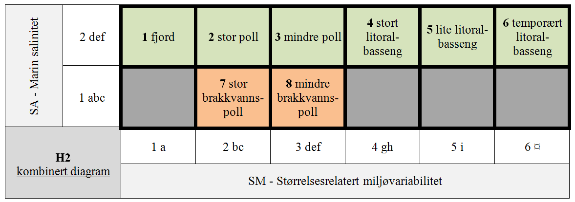 Graden av fysisk avgrensning fra H1 Havvannmasser varierer fra fjord (lang og smal havinnbukting som er overfordypet innenfor en markert terskel nær munningen) via poll [saltvannforekomst som er fysisk avgrenset fra havet, som regelmessig, men ikke permanent, tilføres havvann, som er skilt fra havet av en terskel ovenfor laveste fjærenivå, og som har permanent utløp til (og innløp fra) havet] til litoralbasseng [vannforekomster på fast fjell i fjærebeltet som er fysisk avgrenset fra havet, som regelmessig, men ikke permanent, tilføres havvann, og som ikke har permanent utløp til (og innløp fra) havet]. Som økosystem er disse vannmassene et delvis lukket system. Tilførsler av ferskvann med løst og partikulært organisk materiale fra land medfører redusert saltholdighet som ofte varierer sterkt gjennom året. I sterkt avsnørte fjordarmer og poller der store elver renner ut, kan vannet deler av året bli svært brakt. Med unntak for dype fjorder, som kan ha bunnvann av atlantisk havvann (som skal typifiseres som H1 Havvannmasser), kjennetegnes fysisk avgrensete saltvannsforekomster av at vannet sirkulerer, enten to ganger i året, vår- og høstsirkulasjon, som i innsjøer, eller (i dypere fjorder) i sommersesongen. Med økende grad av avsnøring fra havet og avtakende størrelse byttes artene som er typisk for havvannmassene gradvis ut og erstattes dels med ferskvannstilpassete arter, dels med arter med stor toleranse overfor variasjon i temperatur og salinitet som man finner i litoralbasseng.