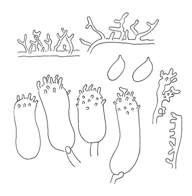 Hatthudshyfer, sporer, cheilocystidier og endeceller i stilkhud.