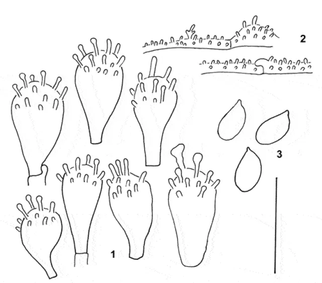 1. Cheilocystidier, 2. Hatthudshyfer, 3. Sporer.