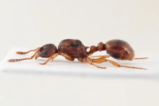 Dronning av skogeitermaur Myrmica ruginodis, fra siden.