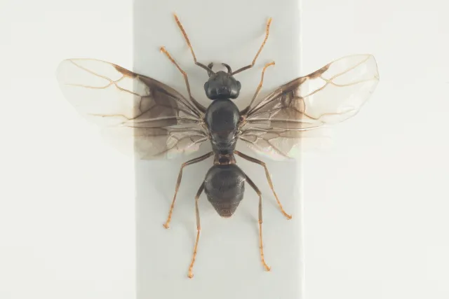 Hannen har utstående hår på antenneskaftene og flere tenner på mandiblene.