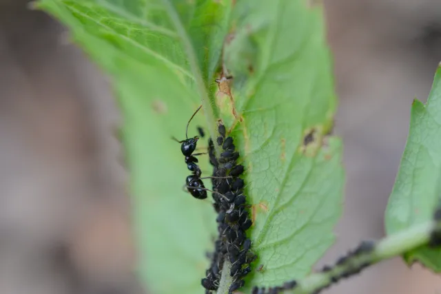 Svart tremaur Lasius fuliginosus gjeter bladlusa Stomaphis quercus. Sandefjord i Vestfold, 12. august 2015.