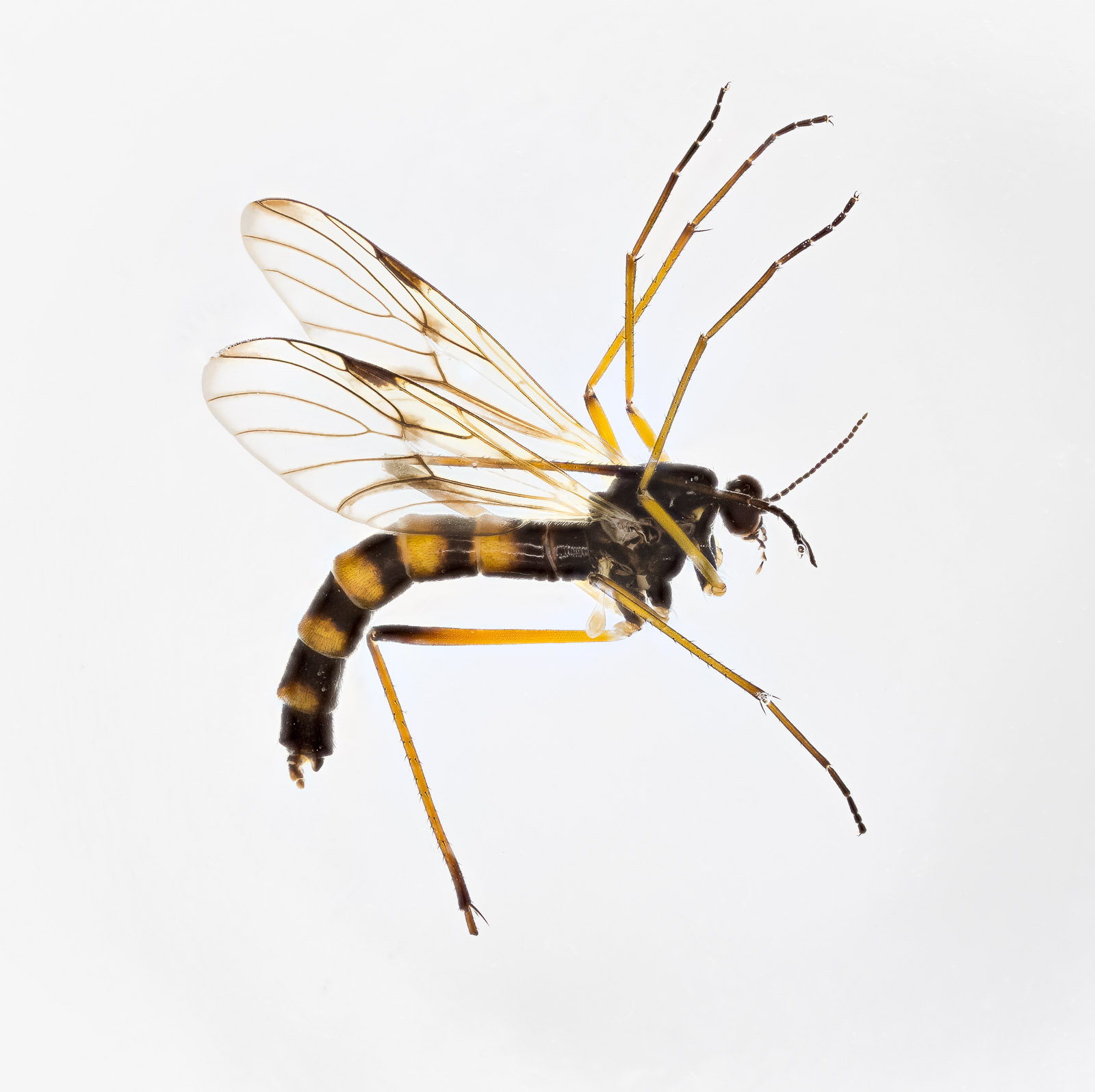 Collage av en hann urmygg - Pachyneura fasciata - funnet i Harrelv naturreservat på Varangerhalvøya i 2017.
