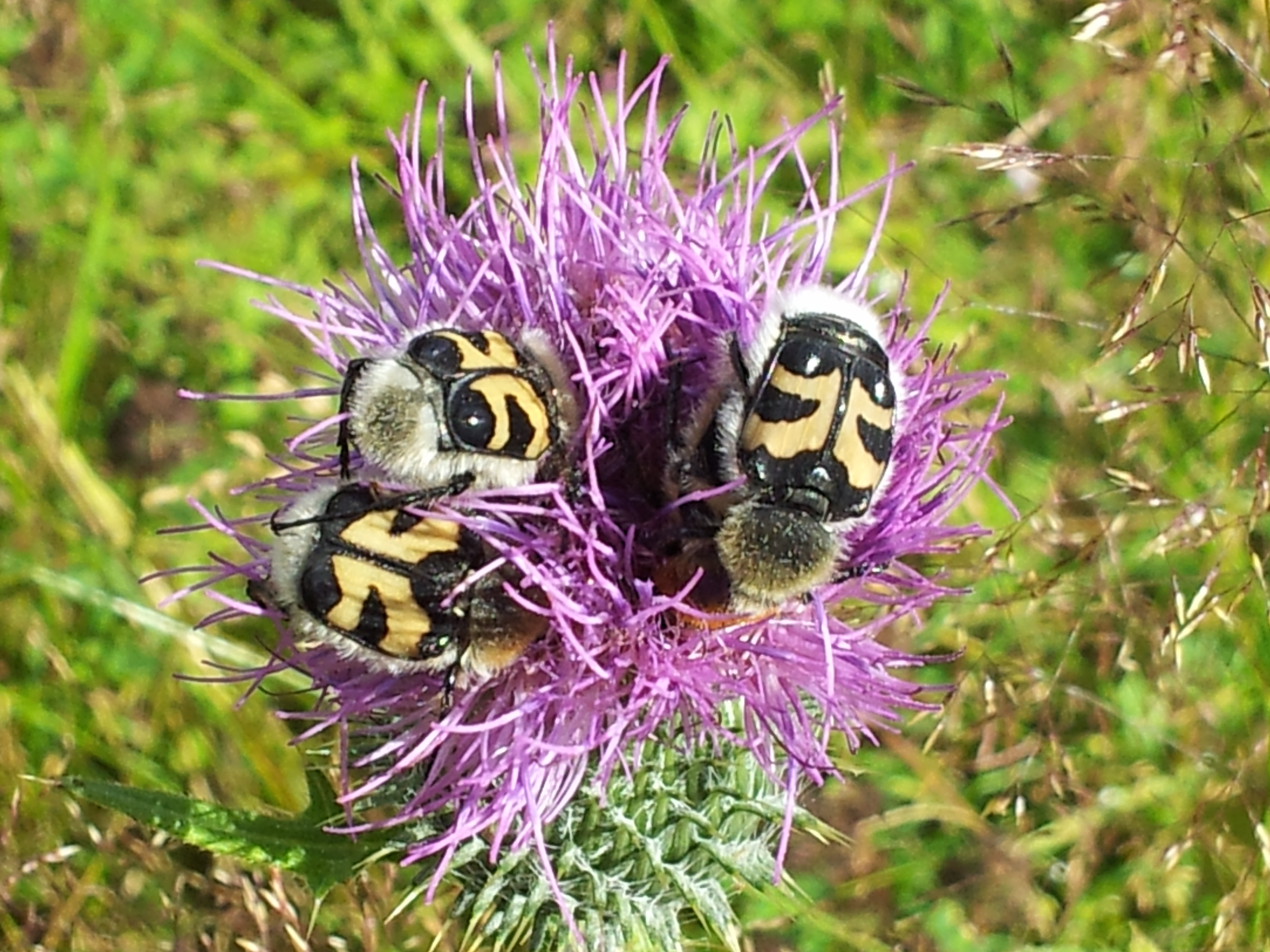 Humlebiller Trichius fasciatus på hvitbladtistel, Munkvoll, Oppdal i Sør-Trøndelag.