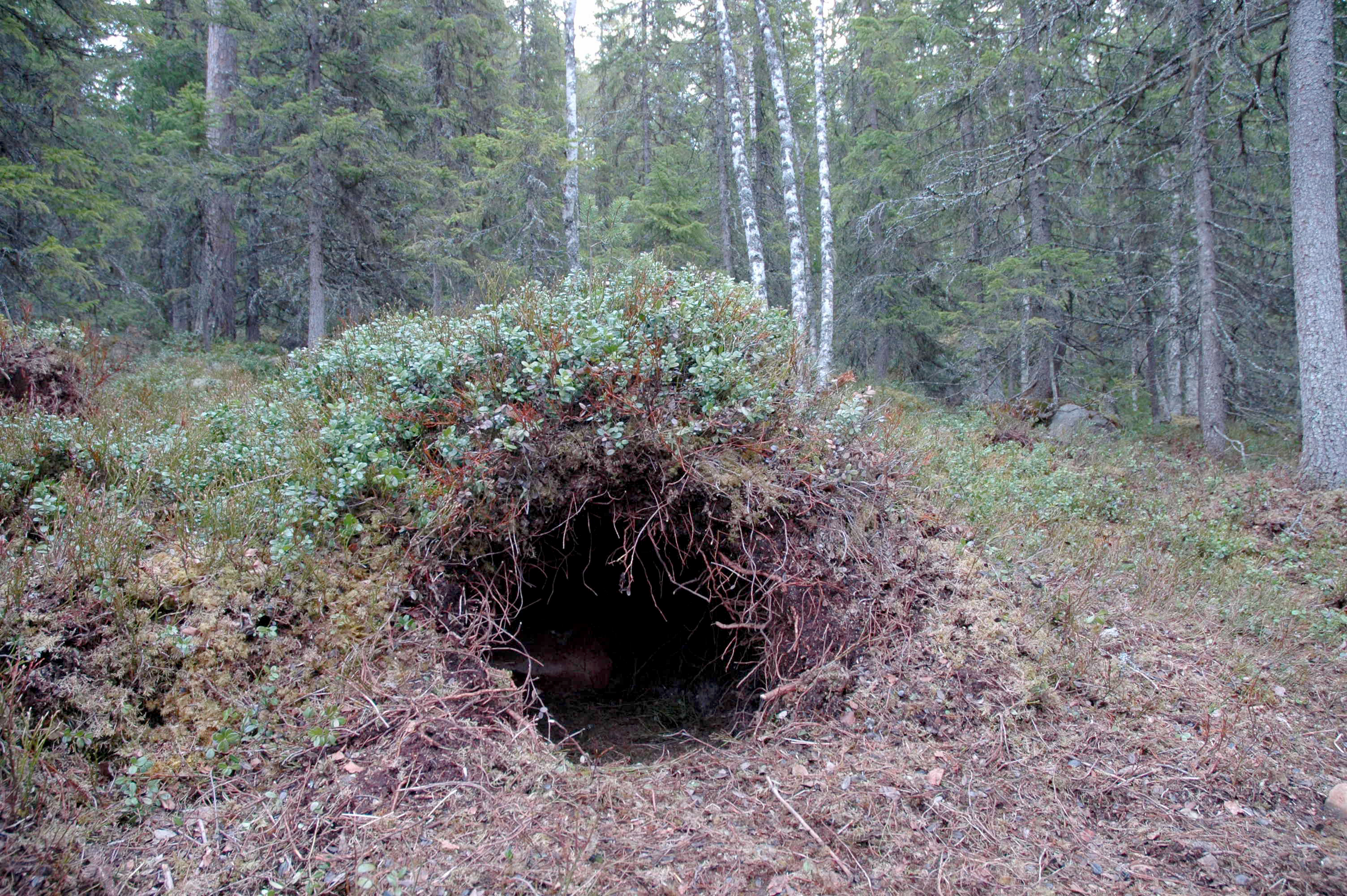 En gammel maurtue, eller nedfallstrær der røttene er delvis dradd opp, er et vanlig utgangspunkt for hi. Bjørnen graver seg inn til det blir et passe stort hulrom. I områder med lett jord kan dyrene grave seg inn i bakken nær sagt hvor som helst, og i enkelte tilfeller lager de bare en seng av bar og lyng og lar seg snø ned på mer eller mindre åpen mark.
